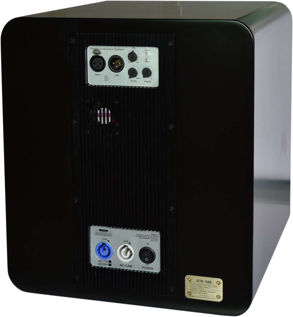 U10-500超低頻音箱為長(zhǎng)方形,落地安放,用前導(dǎo)氣孔設(shè)計(jì),寬340mm高370mm深340mm。
