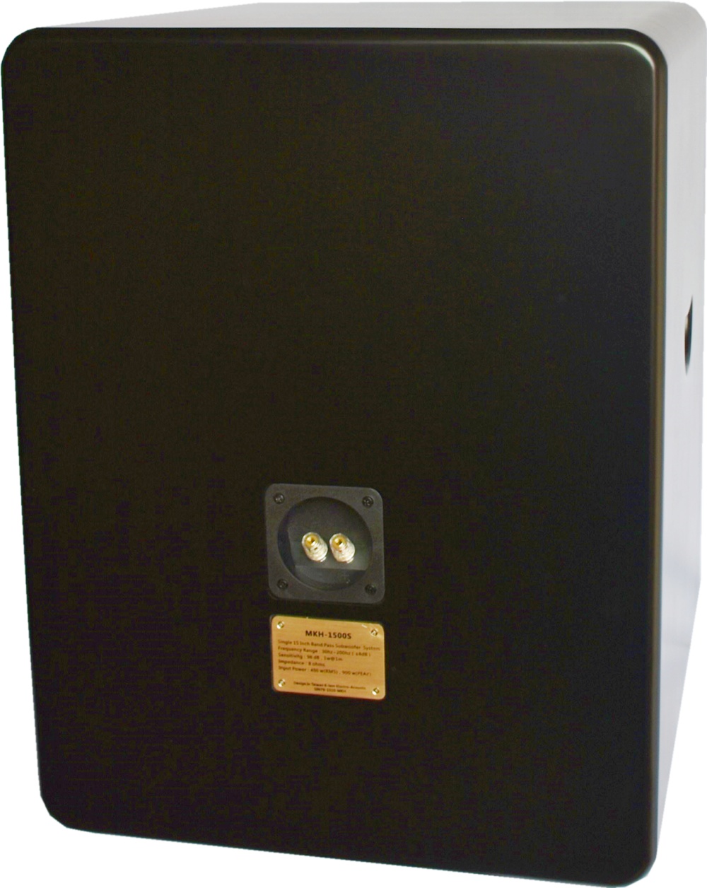 M&K-1500S超低頻音箱為長(zhǎng)方形,落地安放,用前導(dǎo)氣孔設(shè)計(jì),寬440mm高570mm深500mm。