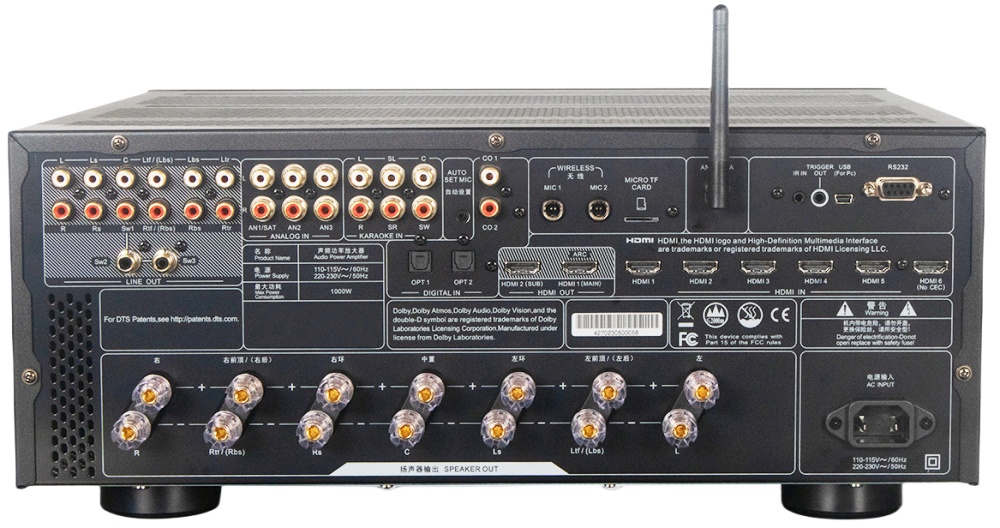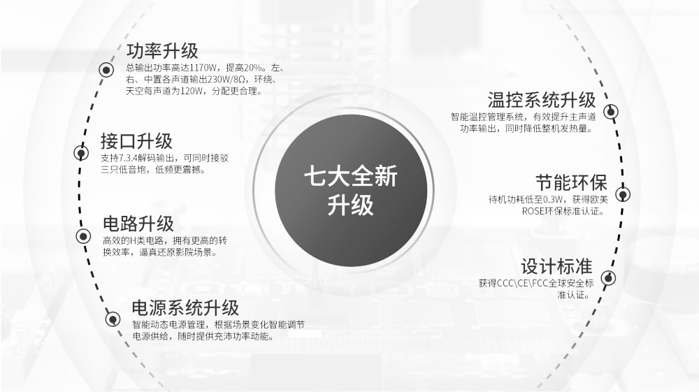 環(huán)繞、天空每聲道為120W,分配更加合理,可直接驅(qū)動(dòng)5.1.2聲道配置的揚(yáng)聲器;