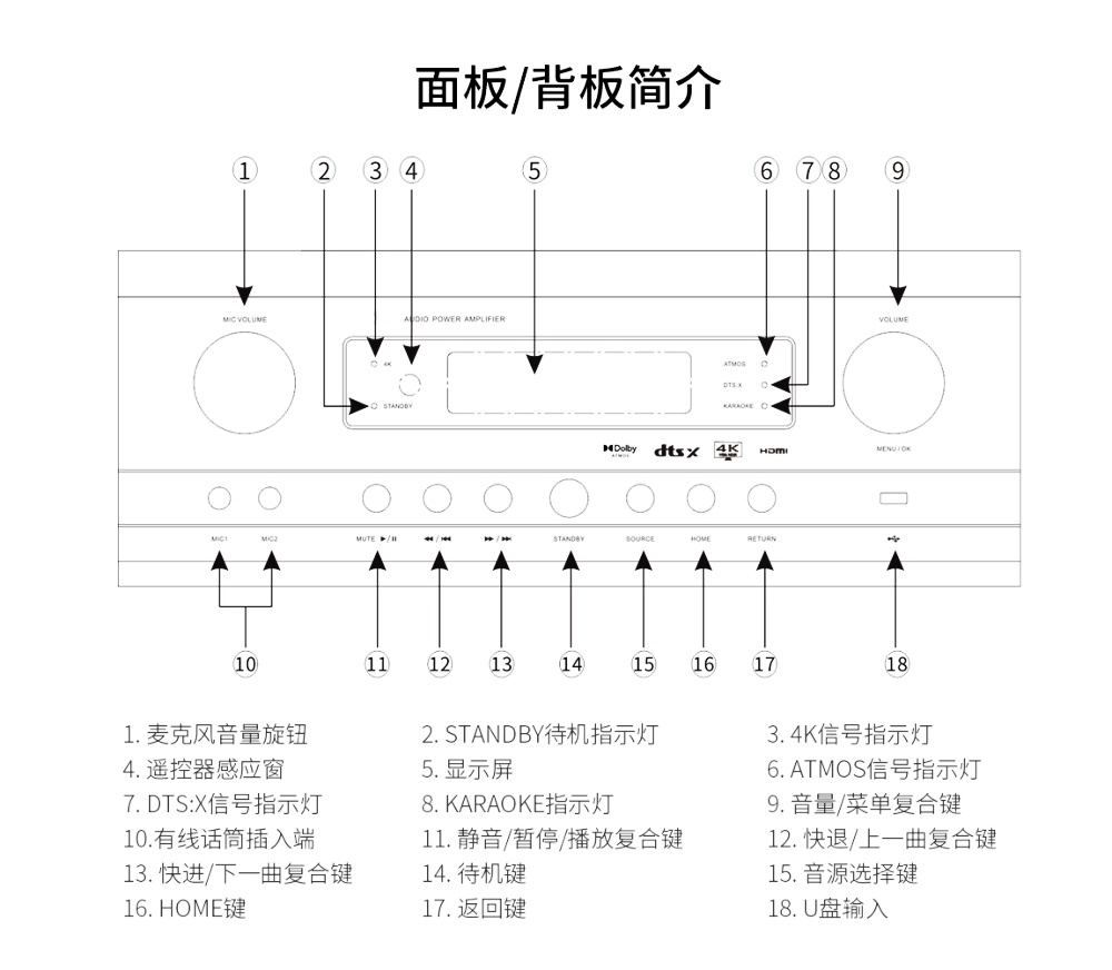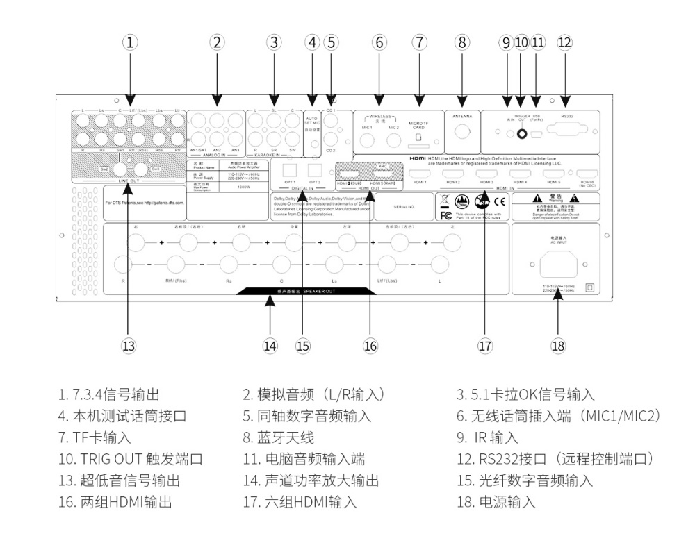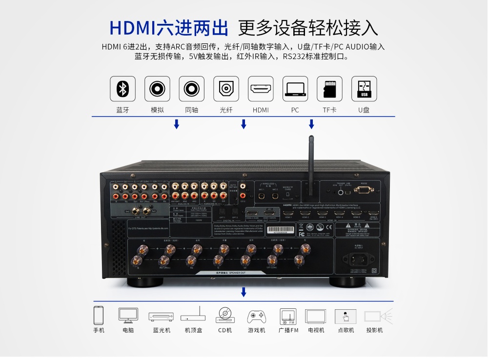 支持HDMI2.1六進(jìn)兩出,2組同軸2組光纖數(shù)碼音頻輸出,3組模擬音頻輸入;