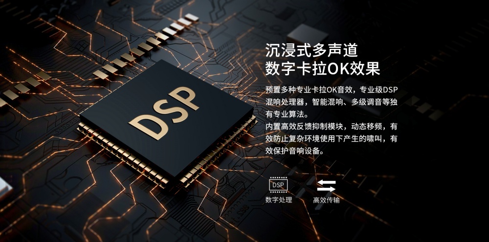 內(nèi)置卡拉OK功能,內(nèi)置多抽頭式DSP混響處理器;