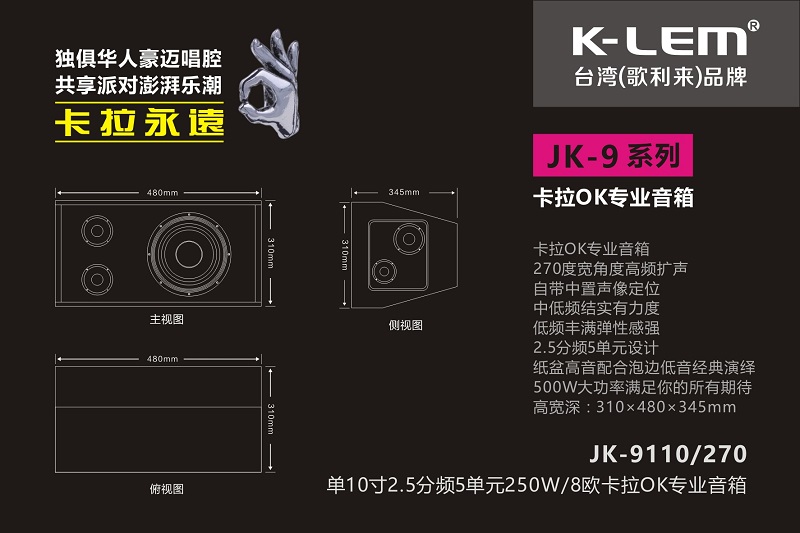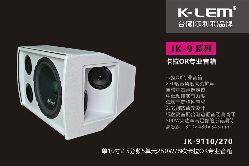 5、JK-9110/270音箱配置了低音10寸(專為包房專業(yè)音箱使用定向開發(fā)設計,臺灣泡邊120磁51芯)×1只+中高音3寸(直達180度擴聲)×2只)+泛高音3寸(側(cè)中左右45度擴聲,1只45度側(cè)后中墻擴聲,經(jīng)反射后形成虛擬中置聲象,另1只側(cè)前45度擴聲,配合2只3寸中高音直達180度擴聲,形成主區(qū)寬角聲場)×2只。