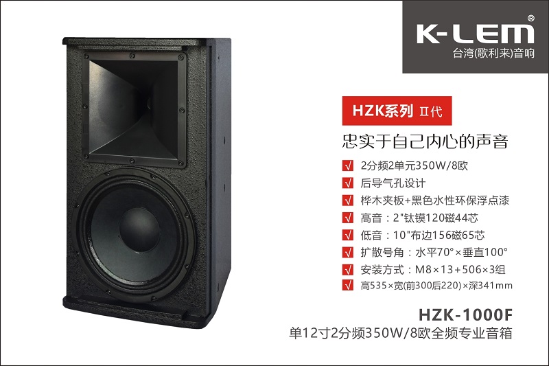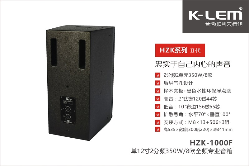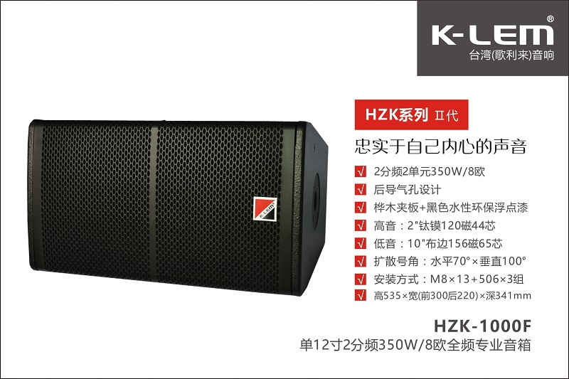 1、HZK系列二代專業(yè)音箱是臺(tái)灣K-LEM(歌利來)品牌針對(duì)固定安裝、房間卡拉OK、廳堂音樂播放、高質(zhì)量語(yǔ)言擴(kuò)聲、中小型演藝領(lǐng)域而開發(fā)生產(chǎn)的一款高標(biāo)準(zhǔn)、高配置的專業(yè)音箱系統(tǒng)。