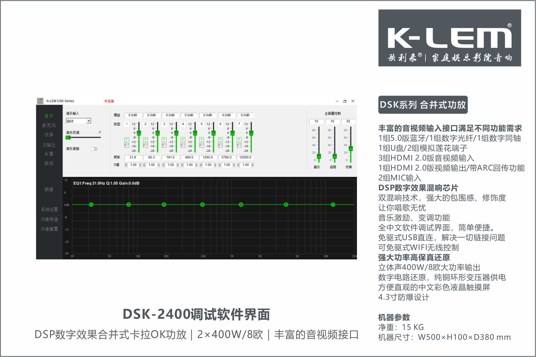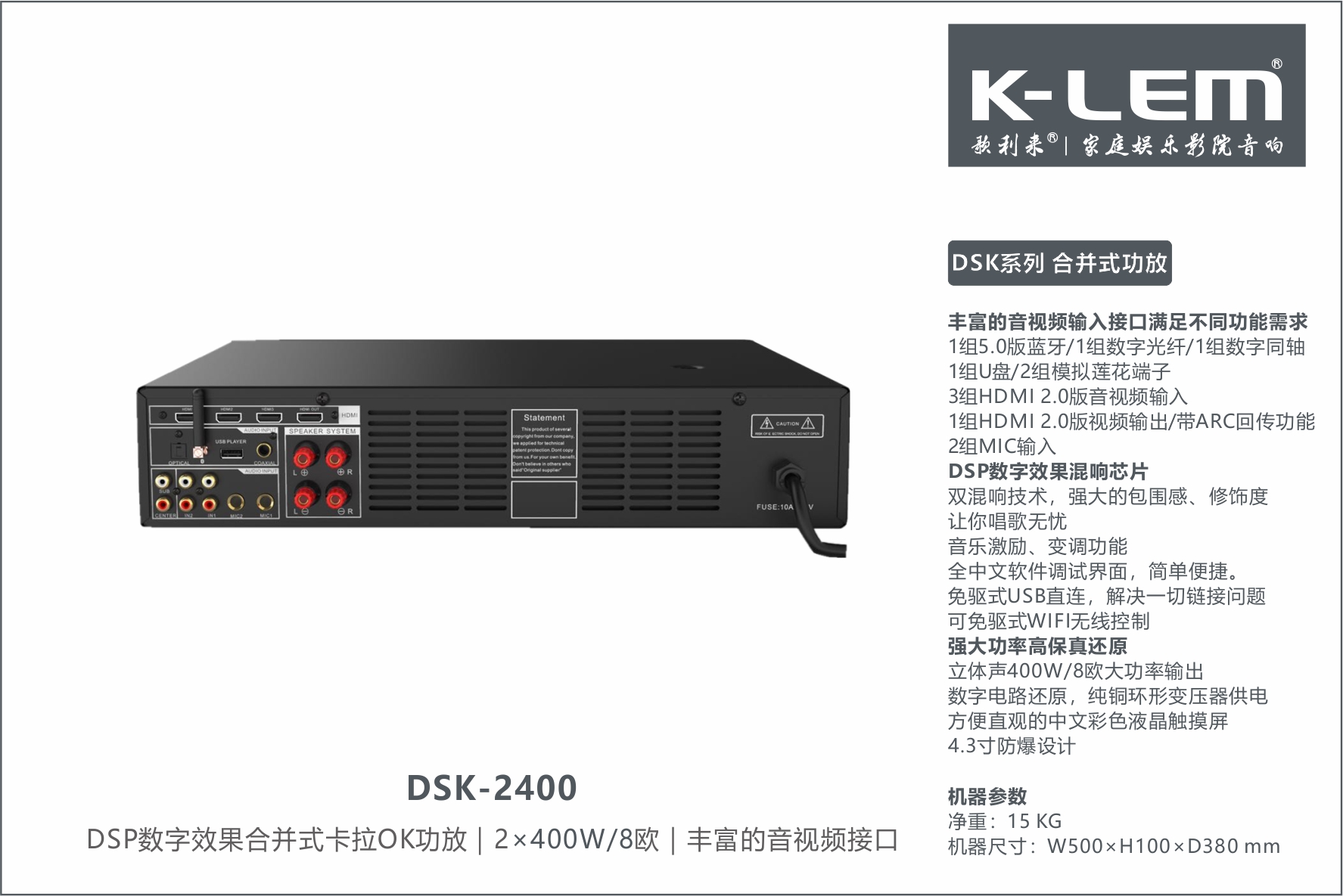 1、DSK系列合并式卡拉OK放大器為臺灣歌利來K-lem品牌針對家庭卡拉OK、商業(yè)KTV、背景音樂、多功能會議室、高品質(zhì)教學(xué)而升級開發(fā)的一款多合一合并式功率放大器。