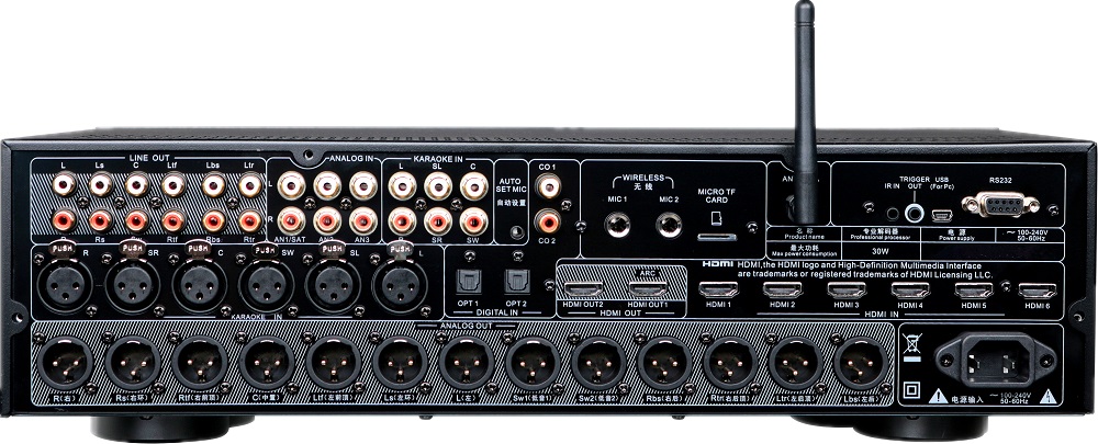內(nèi)置卡拉OK功能,內(nèi)置多抽頭式DSP混響處理器;同時支持5.1聲道外部混音輸入,可外接音頻輸入(前級效果器或調(diào)音臺)。