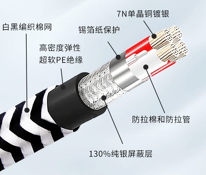 3、7N單晶銅鍍銀線基,身線柔軟,堅(jiān)固耐用,線身直徑7.2mm單根主芯1.5mm,防拉棉和防拉管、錫箔紙保護(hù)、130%純銀屏蔽層、高密度彈性超軟PE絕緣、黑色編織棉網(wǎng),良好的彈性和韌性;