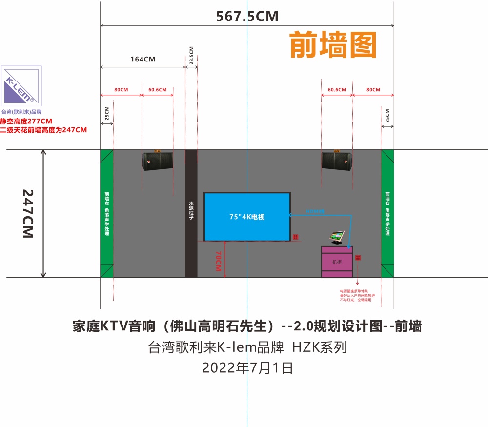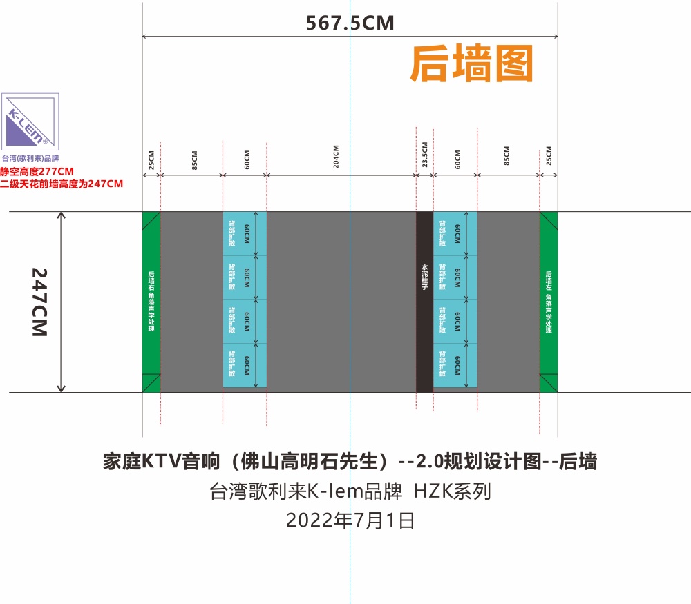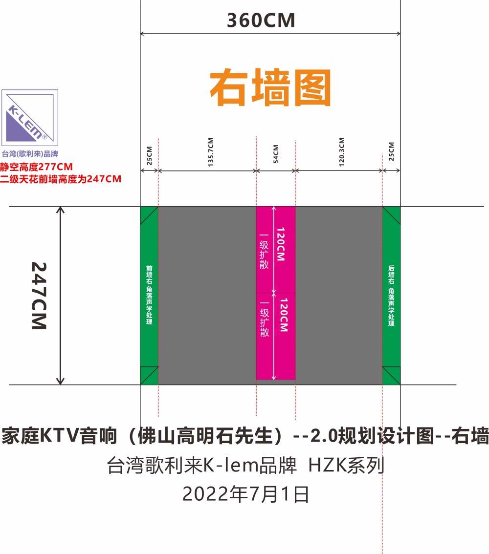 2)、頂部四周建二級天花,高度為247cm,中央地帶為一級天花,高度為270cm,增加空間高度,同時吸音部分頂部反射聲;