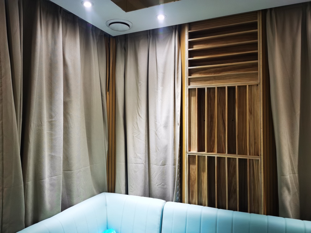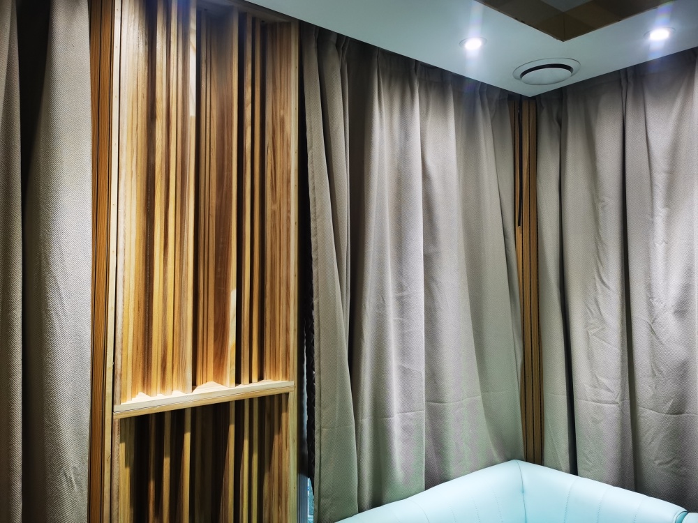 2、擴散板材+吸音窗簾的配音,有效地解決了房音回聲過大的問題,混響時間控制在1.2ms;