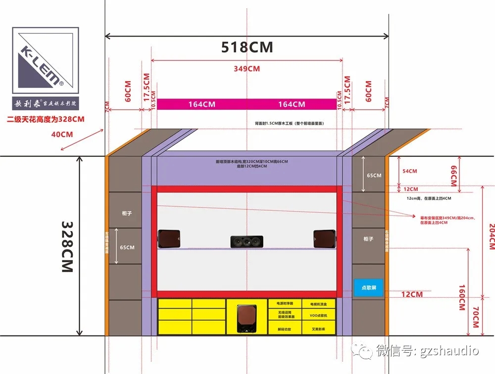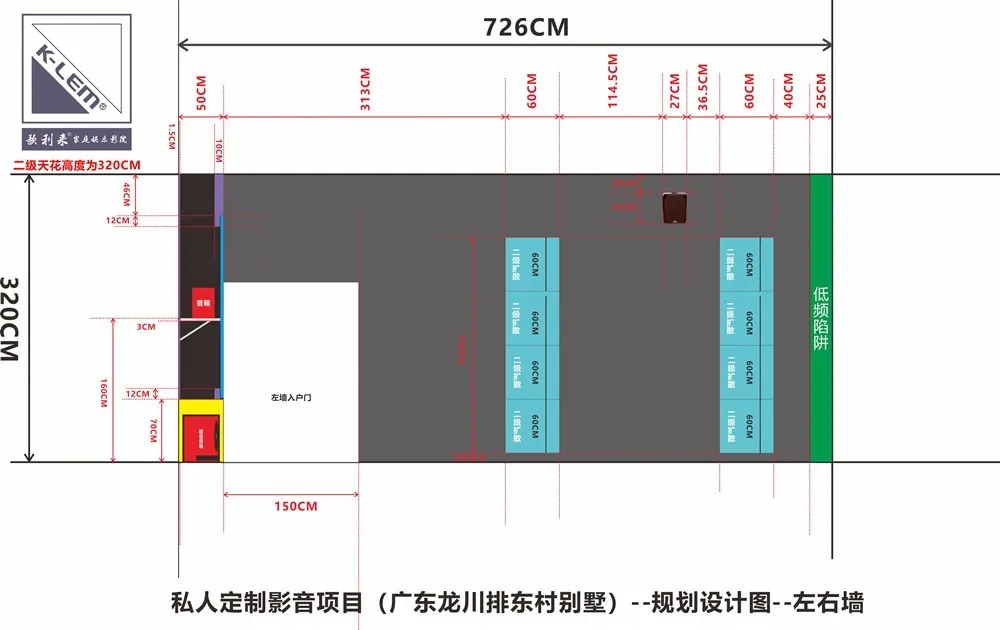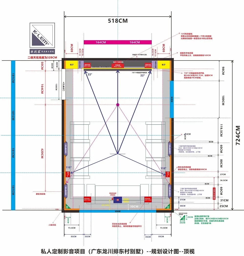 1、本案例座標位于廣東河源龍川某自建別墅影音室,原始尺寸是寬518cm深724cm,二級天花設(shè)定為328cm。