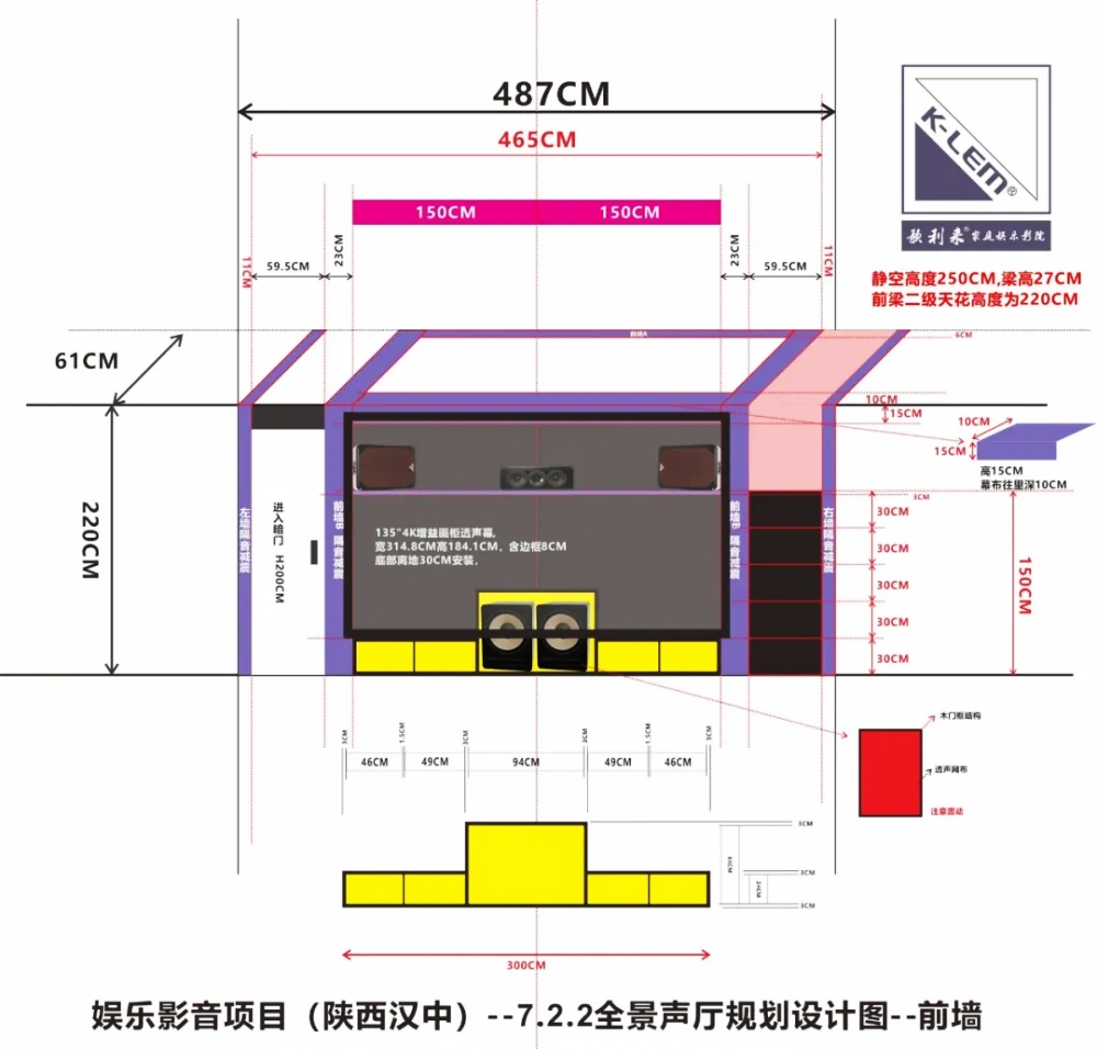 2)前墻規(guī)劃一個深60cm寬300cm的空間為音箱做隱藏式方式安裝,可以得到一個135寸的投影幕布尺寸,并采用透聲幕;