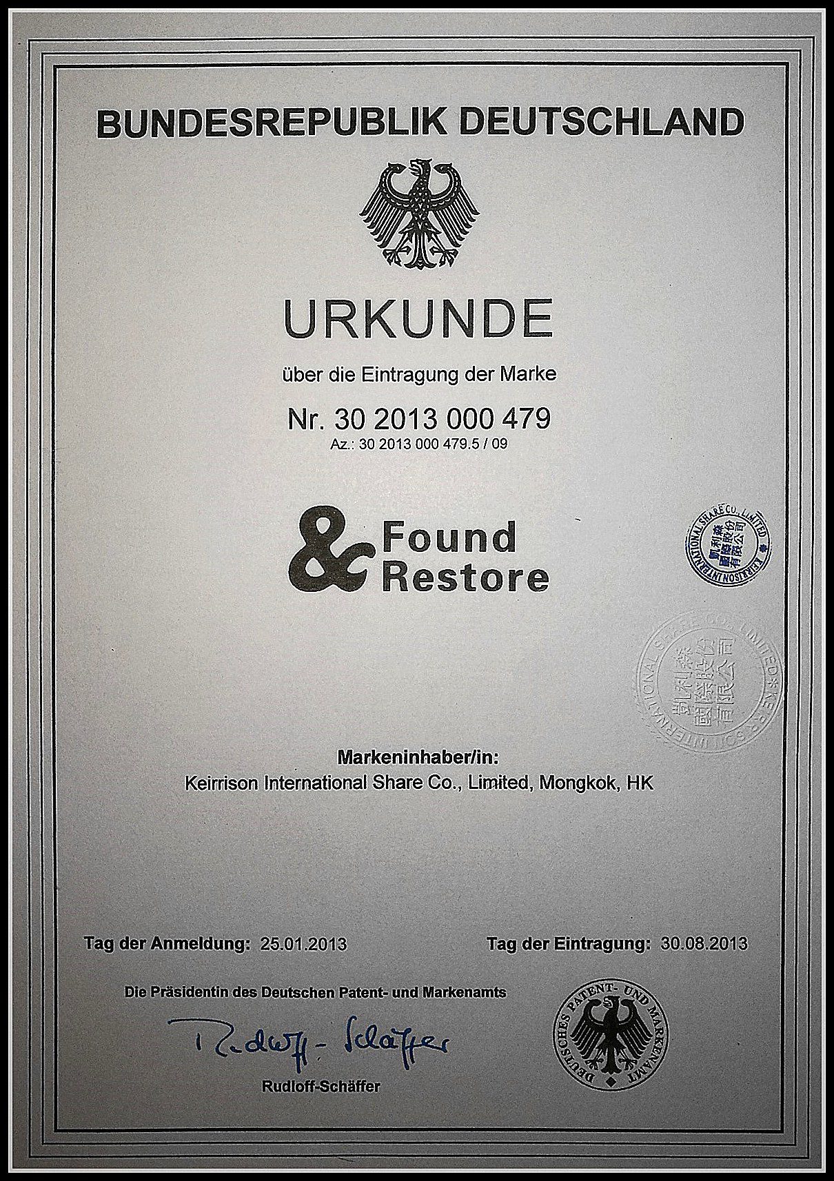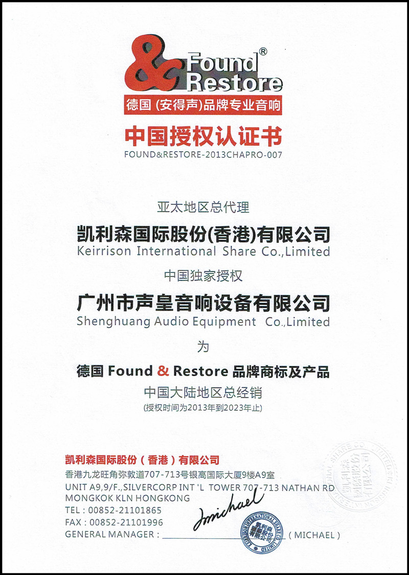 Found&Restore商標(biāo)持有人:香港凱利森國際股份有限公司,德國注冊號為:30 2013 000 479#,申請國際分類號為:第9類;指定中文翻譯為: "安得聲"。中國獨(dú)家授權(quán)總經(jīng)銷:廣州市聲皇音響設(shè)備有限公司。